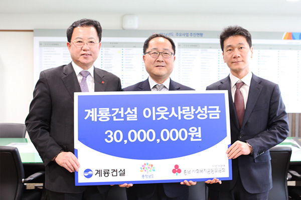 먼저 계룡건설은 지역을 대표하는 기업으로 대전·충남·세종지역에 매년 기부활동을 통해 나눔캠페인에 동참하고 있으며 연말연시에는 더불어 사는 따뜻한 사회 분위기를 조성하고 시민의 온정과 사랑을 불우한 이웃에게 전달하는 희망 나눔 캠페인에 참여하고 있다.