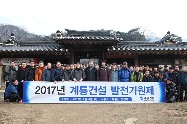 계룡건설은 지난 2월 4일 계룡산 신원사에서 2017년 한 해 계룡건설의 밝은 미래를 염원하는 발전기원제를 실시했다. 한승구 계룡그룹 부회장을 비롯한 임원 50여 명은 함께 연천봉에 올라 정상에서 발전기원제를 지내며 올 한 해 수주 확대, 무사고 안전, 회사 발전 및 매출 증대 등을 기원했다.