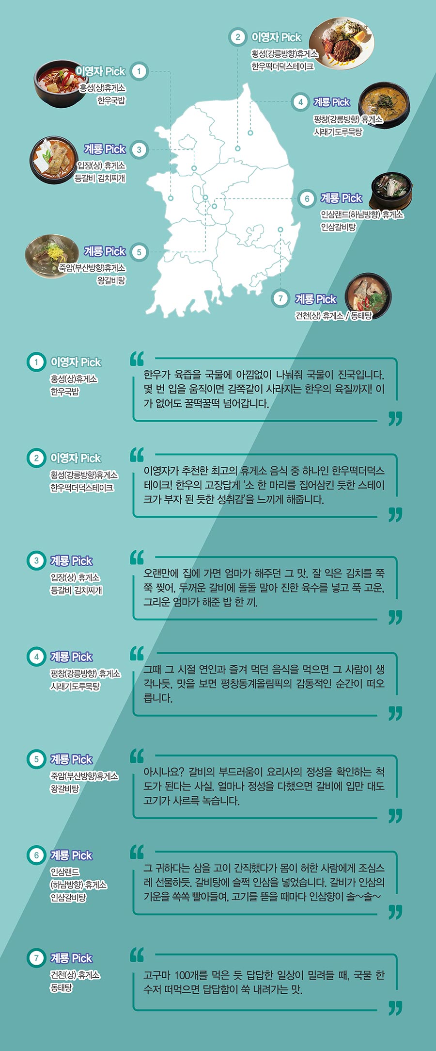 최근, 예능인 이영자가 마치 한 편의 시처럼 입맛 돋게 휴게소 추천 메뉴를 표현하며 다시한번 예능감을 발휘하고 있다. 이로 인해 이영자가 소개한 음식을 포함해 휴게소 전체 매출이 급증하는 현상까지 벌어졌다. 이에 한국도로공사가 감사편지를 보낸 것은 물론, 이영자는 휴게소 완판녀라는 애칭까지 얻게 됐다. 본격적인 여름 휴가철이 돌아왔다. 이번 여름휴가를 더욱 맛있게 만들어 줄 이영자와 계룡그룹이 추천하는 휴게소 음식을 알아보자.